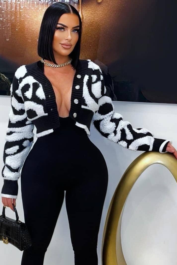 The Color Block Crop Sweater Cardigan features a striking black and white pattern that adds a contemporary flair to any wardrobe. This stylish piece combines comfort and elegance, making it perfect for layering or wearing on its own. The cropped design enhances the silhouette, while the unique color block pattern ensures a fashionable statement for both casual and semi-formal occasions.